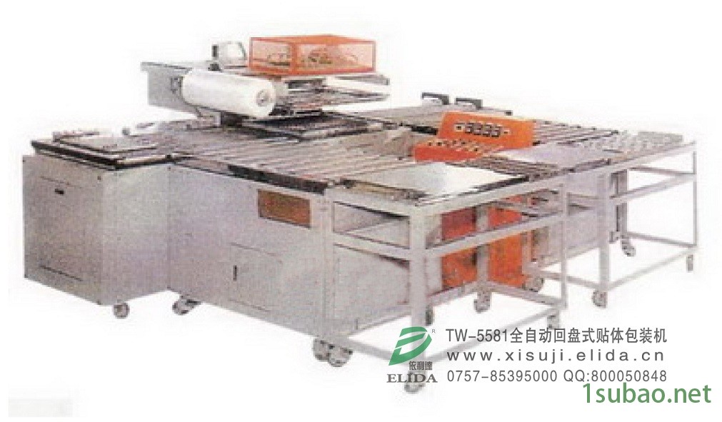 依利达TW-5581全自动回盘式贴体包装机(又称为广州PCB线路板自动真空贴体包装机/东莞五金工具密着包装膜贴体机/深圳灯饰配件体贴包装膜自动包装机械/佛山家具螺丝体贴膜真空贴体包装设备/惠州汽车零部件透明体贴膜包装机/中山餐具贴体包装机):包装任何形状的物品均不需模具,包装程序简捷,透明美观,立体感强,防潮防尘。只需人工将摆放产品的铝板推至进料动力滚筒架,设备自动完成下面工作。自动进料,加热,真空贴体,自动出料,切断,滚筒架输送出成品至出料平台。