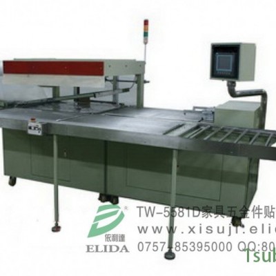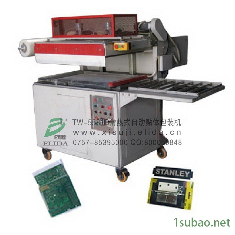 依利达TW-5581B常热式自动贴体包装机(又称为东莞长安PCB线路板自动真空贴体包装机#广州花都汽车配件PE体贴膜包装设备#小榄古镇灯饰五金制品密着膜包装机械#中山东凤电子组件透明薄膜包装贴体机#顺德龙江铰链PVC体贴包装膜自动包装机#高要金利不锈钢拉手贴体包装机):将贴体包装膜加热软化后覆盖在产品及底板上,同时于底板下面启用真空吸力,将
