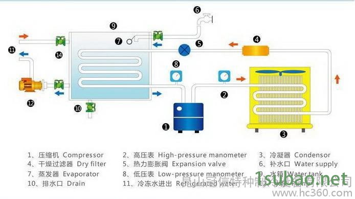 4. 微电脑控制器的保护功能:具有压缩机线圈电流过高的保护、水泵电流过高、冷水流量开关、冷水出水温度过低保护、 温度过高保护、压缩机过载保护、启停频繁保护、电压异常保护、高低压保护等保护功能;