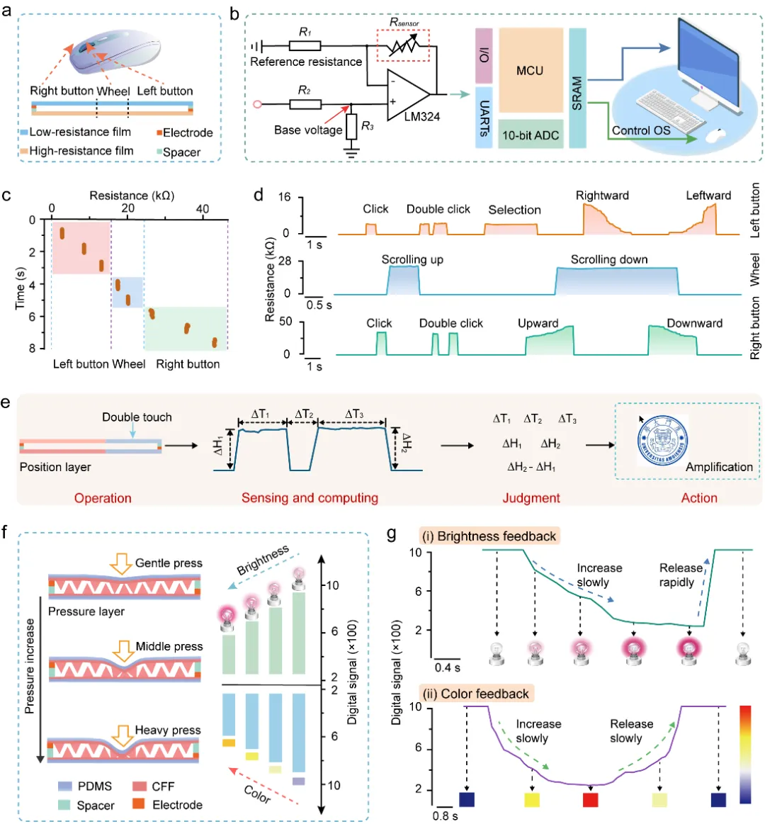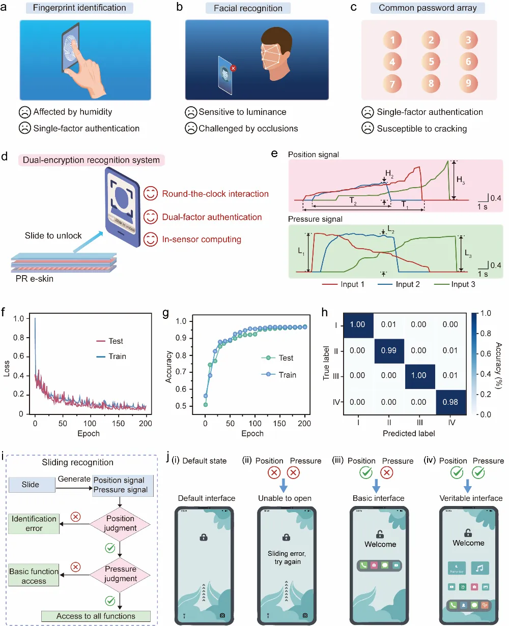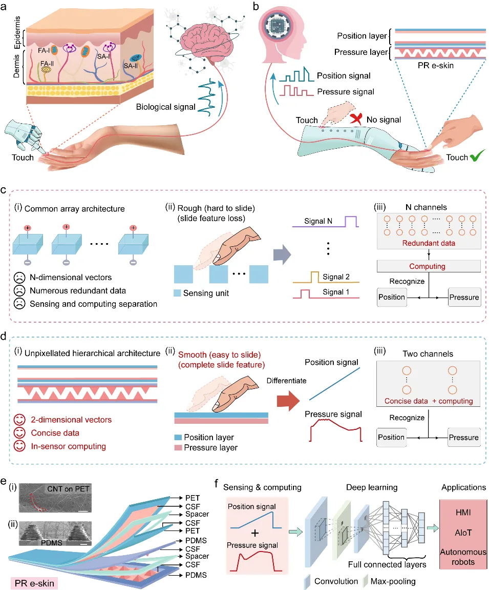 近期, 厦门大学 廖新勤等人提出了一种集成了传感、计算和决策功能的位置和压力感知电子皮肤(PR电子皮肤)来解决这一挑战。研究团队设计了一种分层协同的结构,该结构允许PR电子皮肤能够在数据终端有选择地提取有效的数据。PR电子皮肤基于“事件驱动”的工作模式只有当触摸事件发生时,才产生数据,这进一步缩小了数据量。这些特性共同实现了原始数据的优化,同时保留完整和关键的触摸信息,从而显著加快后续的计算速度。PR电子皮肤由位置层(图2)与压力层(图3)构成,位置层与压力层采用类似的结构实现了不同功能的感知。最后,研究团队对PR电子皮肤在人机交互领域中的应用场景进行了验证(图4、图5和图6),表明其在可穿戴设备、智能机器人和智慧互联网等方面具有潜在的应用场景。相关研究成果以“A Programmable Electronic Skin with Event-Driven In-Sensor Touch Differential and Decision-Making”为题发表于Advanced Functional Materials。厦门大学电子科学与技术学院陈忠教授和廖新勤副教授为论文共同通讯作者,第一作者为厦门大学硕士生曹智诚,新加坡南洋理工大学郑元谨教授(卓越集成电路设计中心主任)和 北京科技大学 廖庆亮教授( 长江 学者特聘教授、院长)提供重要支持帮助。研究工作得到了国家自然科学基金、福厦泉国家自主创新示范区合作项目、福建省自然科学基金和中央高校基本科研业务费等资助。 图2 位置层的传感机理和性能测试 图3 压力层的传感机理和性能测试 图4 位置层与压力层的应用场景 图5 PR电子皮肤的性能探究 图6 PR电子皮肤用于双重密码滑动识别系统 总的来说,研究团队提出了一种集传感、计算和决策于一体的位置和压力感知电子皮肤。多功能识别能力、紧凑的传感器内存和低计算消耗为人机交互、智慧互联网和智能机器人的应用提供了新的机会。PR电子皮肤为构建具有事件驱动传感器内计算的位置和压力感知系统提供了一个理想和重要的替代方案。