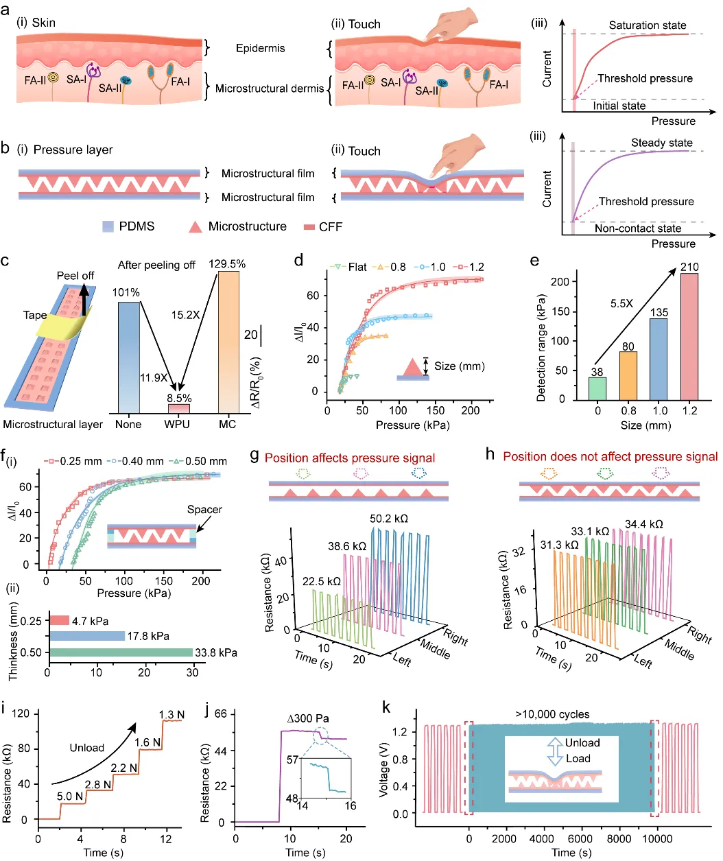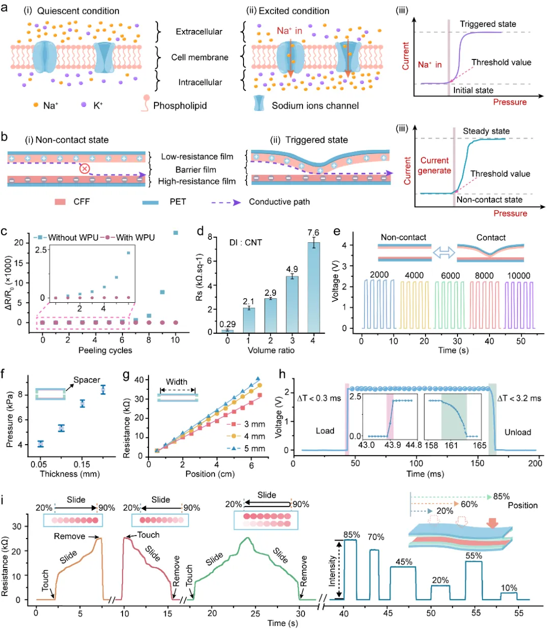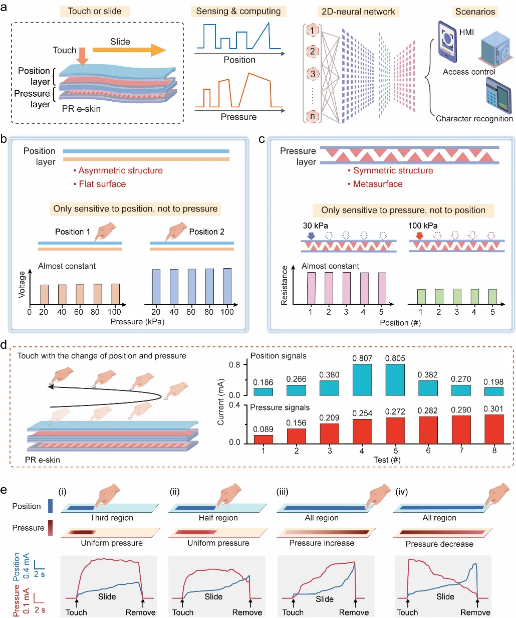 近期, 厦门大学 廖新勤等人提出了一种集成了传感、计算和决策功能的位置和压力感知电子皮肤(PR电子皮肤)来解决这一挑战。研究团队设计了一种分层协同的结构,该结构允许PR电子皮肤能够在数据终端有选择地提取有效的数据。PR电子皮肤基于“事件驱动”的工作模式只有当触摸事件发生时,才产生数据,这进一步缩小了数据量。这些特性共同实现了原始数据的优化,同时保留完整和关键的触摸信息,从而显著加快后续的计算速度。PR电子皮肤由位置层(图2)与压力层(图3)构成,位置层与压力层采用类似的结构实现了不同功能的感知。最后,研究团队对PR电子皮肤在人机交互领域中的应用场景进行了验证(图4、图5和图6),表明其在可穿戴设备、智能机器人和智慧互联网等方面具有潜在的应用场景。相关研究成果以“A Programmable Electronic Skin with Event-Driven In-Sensor Touch Differential and Decision-Making”为题发表于Advanced Functional Materials。厦门大学电子科学与技术学院陈忠教授和廖新勤副教授为论文共同通讯作者,第一作者为厦门大学硕士生曹智诚,新加坡南洋理工大学郑元谨教授(卓越集成电路设计中心主任)和 北京科技大学 廖庆亮教授( 长江 学者特聘教授、院长)提供重要支持帮助。研究工作得到了国家自然科学基金、福厦泉国家自主创新示范区合作项目、福建省自然科学基金和中央高校基本科研业务费等资助。 图2 位置层的传感机理和性能测试 图3 压力层的传感机理和性能测试 图4 位置层与压力层的应用场景 图5 PR电子皮肤的性能探究 图6 PR电子皮肤用于双重密码滑动识别系统 总的来说,研究团队提出了一种集传感、计算和决策于一体的位置和压力感知电子皮肤。多功能识别能力、紧凑的传感器内存和低计算消耗为人机交互、智慧互联网和智能机器人的应用提供了新的机会。PR电子皮肤为构建具有事件驱动传感器内计算的位置和压力感知系统提供了一个理想和重要的替代方案。