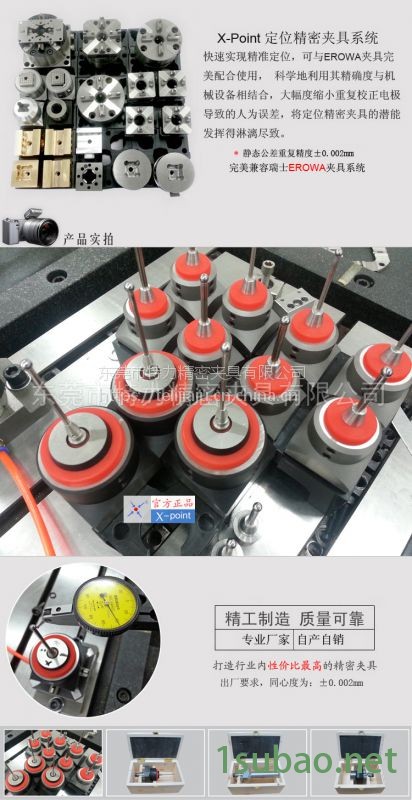 在选用材料和配件方面:我司产品均采用国际知名品牌,如SMC,HASCO及日本优质钢材,配件等,力求产品更加稳定,可与EROWA、System 3R等系统夹具兼容互换;我们更重视全面的售后服务,如现场安装,调试及培训等。因为每家公司有着不同的实际情况以及文化背景,我们将按照实际情况制作工作指引以及定期的维护和保养,确保客户在使用本公司产品后,可以真正提高成本效益。 关于质量方面:对于质量,我们从不敢马虎,深深的懂得“质量是一个企业的生命线”的科学道理,对于批评,我们乐意接受,客户的宝贵意见才是最大的财富。 X-Point定位夹具适用于铣床、磨床、车床、加工中心、放电机、线切割或机外预校机之间快速定位。可完全与EROWA、System 3R等系统配套使用。