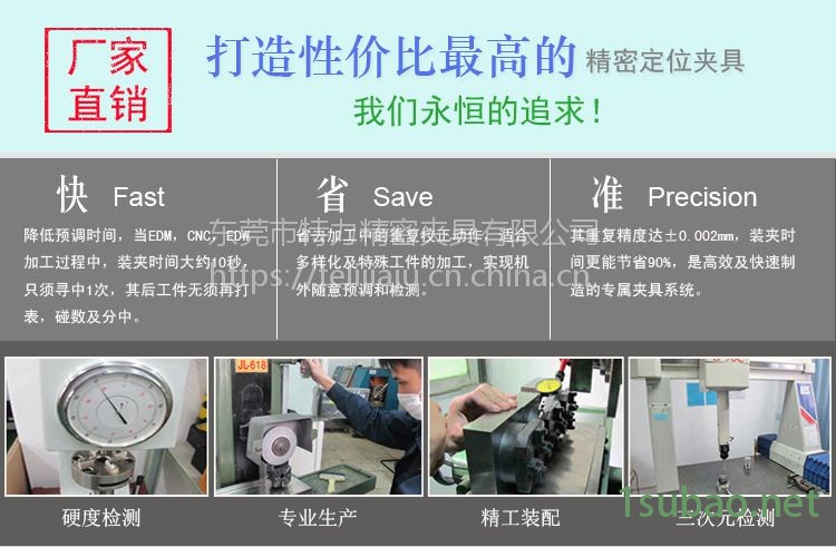东莞市特力精密夾具有限公司 位于世界工厂——中国东莞市。12年来,本公司秉着“专-精-强”的设计理念,可根据您的要求制作出各种高精度的非标产品,更大限度满足您的生产需求。“X-point”定位精密夹具是我们公司为提供在铣床,磨床,车床,加工中心,放电极的加工辅助设备。我司生产的精密模具夹具能够快速准确定位,与EROWA、System 3R等系统夹具完美配合, 科学地利用其精确度与机械设备相结合,大幅度缩小重复校正电极导致的人为误差,将定位精密夹具的潜能发挥得淋漓尽致,本公司产品广泛适用于批量性机械加工企业。由于我始终坚持“重合同守信誉,质量可靠,价格合理"的基本原则,深受全国各地合作伙伴的一致好评,赢得了业界良好的口碑。