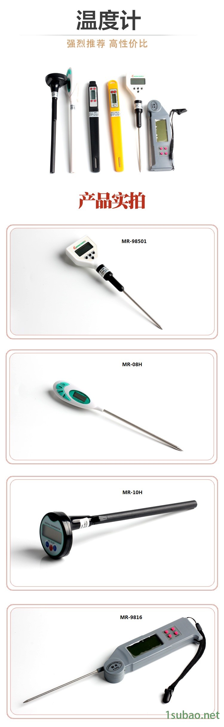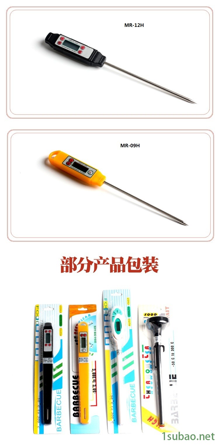 广州铭睿电子科技有限公司MR系列数字温度计,测量范围宽,-50℃~300℃(-58℉~572℉)均可测量;温度计采用不锈钢探头,直接插进被测物体进行测量;笔式设计,便于携带。MR系列数字温度计适用于制冷、制热、食品加工、水果中心温度测量等用途。