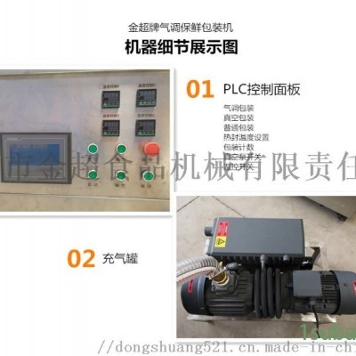 包装机 金超气调包装机基本介绍 自动塑盒封口机属于自动化塑料托盘盒封口设备,整机采用不锈钢304制造,结构简单合理,封口效率高,操作简便;适合于各种尺寸塑料盒,塑料托盘以及异形塑料容器的自动热合封口,广泛适用于制药、日化、食品等行业。 适用范围 金超气调包装机适用范围 自动塑盒封口机适用于快餐盒、熟食托盘、点心盒、方便食品、豆腐盒、饼干盒、外卖盒、豆瓣酱等盒状容器包装容器的自动热合封口。 金超气调包装机 技术参数