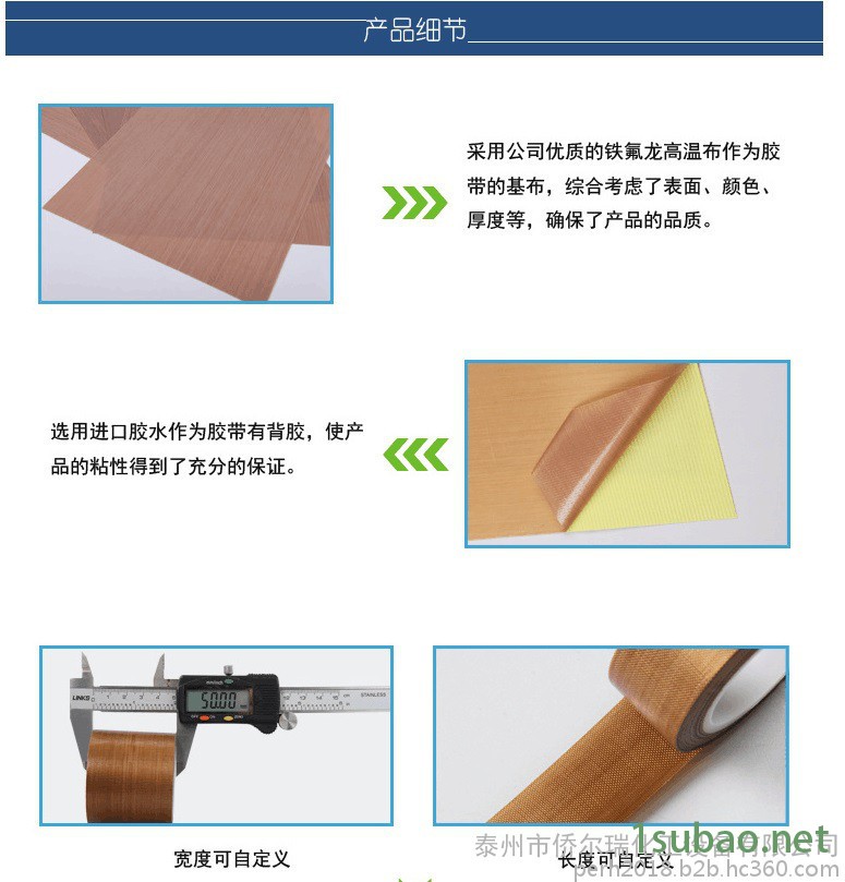 选用进口的玻璃纤维纱后涂覆特氟龙(PTFE)树脂,生产的特氟龙玻璃纤维胶带。一般卷材1米宽,50米每卷。颜色为咖啡色和黑色及白色三种,同时可以分切成各种宽度,并根据客户要求生产各种厚度的粘胶带。