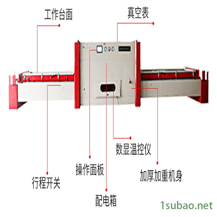 3、工作台采用框式钢架结构,有效提高真空度。交换式工作台 可进行一箱多件贴面,实现一机多用。机身工作台面采用强度钢板,在高温运行时不会变形。