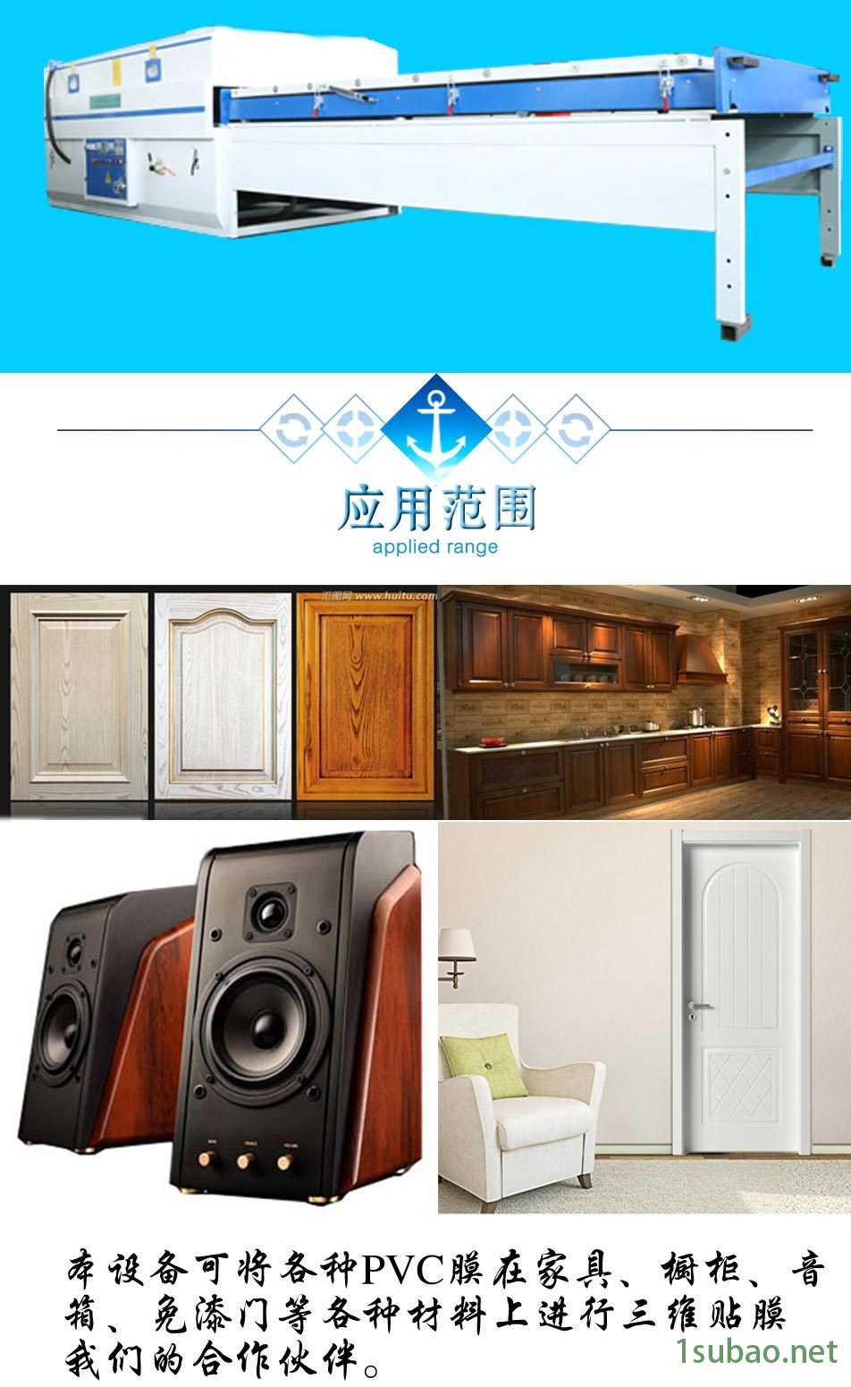 本机是做免漆门覆膜,橱柜门板PVC覆膜,移门覆膜、软包,装饰墙软包,皮革软包等工艺的理想设备。