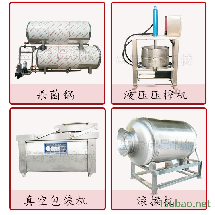 压榨机,夹层锅,搅拌炒锅,多爪炒锅,杀菌锅,高压蒸煮锅,拌馅机,真空包装机,真空滚揉机