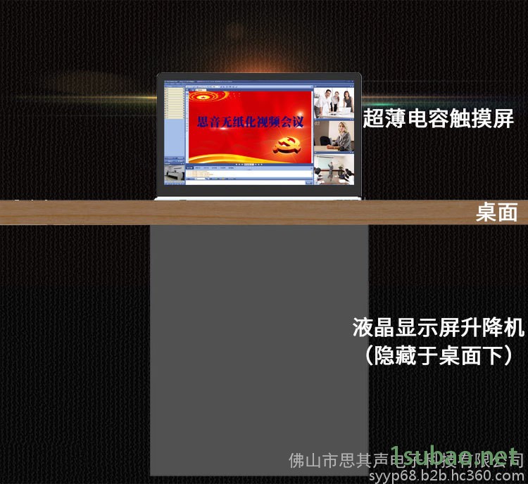 产品本身内置LED显示屏,超薄机身和铝合金精拉丝氧化面板结构,齿合式直线导轨传动方式,机械防夹手设计,一体化机身防护,外观无螺丝,产品使用安全可靠,美观大方。外置VGA、DVI、HDMI等多重信号接口和RS232/485控制接口,产品在启动时,液晶显示屏升降器从箱体内部升出桌面并自动为显示屏供电,产品设有智能仰角0-15°可调节角度功能,满足各个人群的显示屏仰角使用需要。当产品使用完成需要关闭时,显示屏自动返回升降隐藏于箱体内部并自动断开显示屏电源,起到保护显示屏并节约用电的作用。产品具有防盗、防尘、和保持桌面平整清洁,会议场所整齐有序等功能。本系列产品可按客户要求定制。