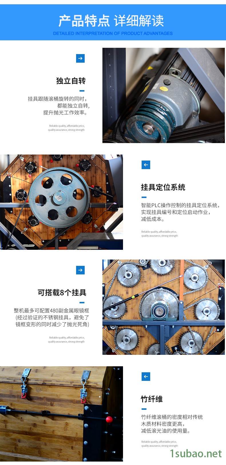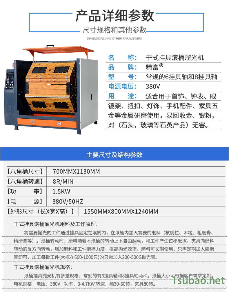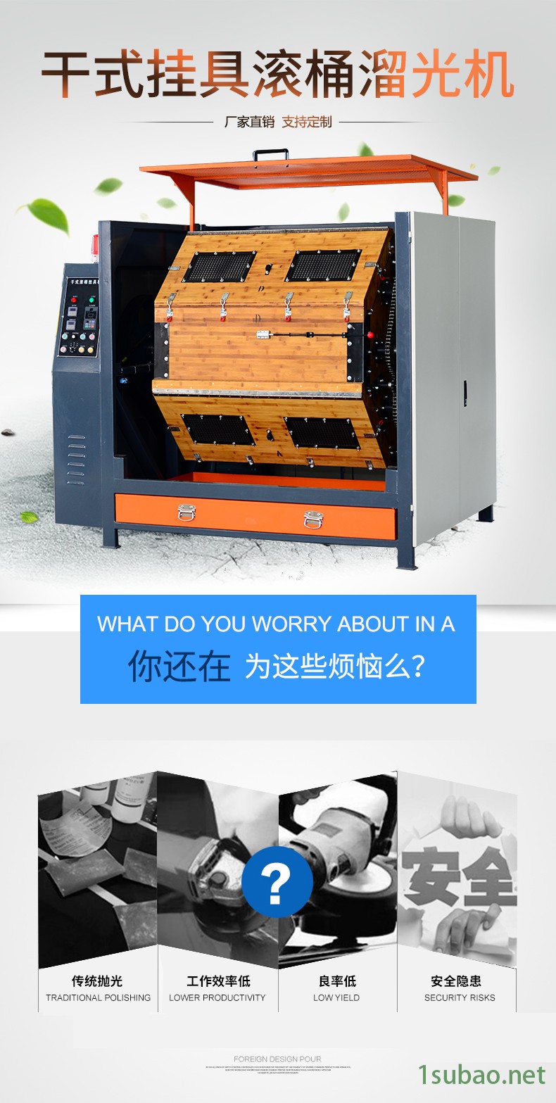 应用特点:●多重 ,同时实现去毛刺毛边、抛光抛亮、塑胶产品倒角等●定时加工,结束提醒,操作极其简单,无任何安全隐患,慢速,可长时间长期使用●干式加工,满足产品镜面亮度需求●双向加工,满足全方位倒角,抛光需求●批量加工,容量大,批量加工非常合适●自动加工,过程无需人工干预,一人可操作多台机器●数字监控,电压、电流、频率、时间均数字化监控●统一加工,大批量生产作业后,工件可保持一致使用方法:1、在开机使用前,应先检查电源是否接合。2、将 磨料、光油等和产品按比例放入后将盖盖上并压紧,接通电源,将倒顺开关打到“顺”位,开动机器。注意:干抛使用的磨料为 磨料,主要有核桃壳、木粒、玉米芯等,并需要 光油。3、产品OK后,将倒顺开关的位置放置到中间位置,此时滚桶停止转动,将滚桶开口位置朝上,取下压杆,打开盖子,将滚桶开口朝下,将产品及磨料一起倒出来即可。4、滚桶的两个轴承请每隔3个月加润滑脂(俗称“黄油”)一次。主要用途主要用于各类不锈钢、铜、铁、白铁等零件的表面增光、镜面抛光用。作业后工件质量一致性好。特点:1、工件可达致布轮抛光效果及布轮难抛到的死角;2、变频调速,定时正反转,保证运转平稳及加工工件的一致性;3、配备卸料门及分选筛,方便操作,提高工作效率;4、内设研磨机桶,加工量大,可同时进行精研磨及超精研磨抛光;5、研磨桶体设有透气孔,保证桶内温度稳定适中;