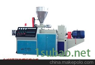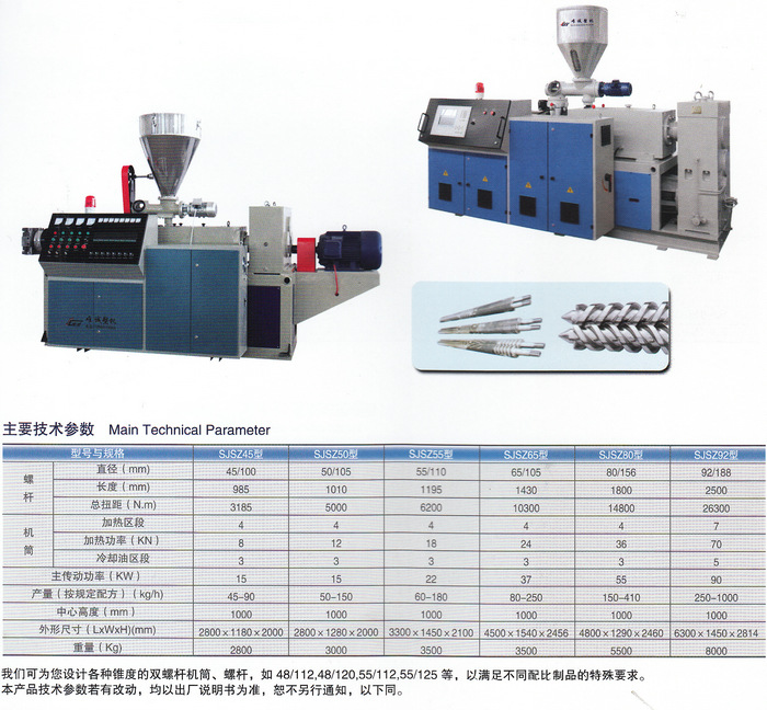 用途 ApplicationSJSZ系列锥形双螺杆塑料挤出机由挤出系统、定量加料装置、真空排气系统、减速箱、分配齿箱箱、加热冷却系统、螺杆芯部调温控制系统、电控系统(包括故障报警系统和扭矩保护装置)等组成。 该机设计先进、结构紧凑、外形美观,配上各种成型机头和相应辅机,可生产管材、异型材、板材、片材及造粒等。该机具有下列特点1、特别适合加工软硬PVC原料,且粉料可直接挤出成型。2、异向旋转的锥形双螺杆使物料字形流动,能满足物料的输送、压缩、混炼、排气、塑化等工艺要求。3、机筒螺杆装拆方便,以利清除残余物料。4、整机安全可靠、运转平稳、低能耗、成本低、高产量、使用寿命长。