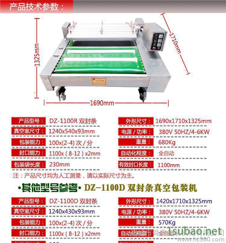 DZ1100系列:工作室垂直升降、采用台湾ABS刹车定位控制,工作平稳,定位准确;进口pvc原料履带、双节距链条**、施耐德电器控制。水冷加热,稳定可靠;可选配进口或国产真空泵,真空效果好,加热条寿命长,食品级304不锈钢板。可以增加充氮气或混合气体功能,满足食品工艺的要求。
