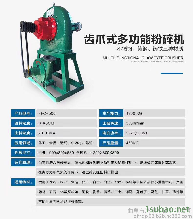 9FZ—系列粉碎机,主要工作零件为安装的转子上的扁齿,圆齿可以粉碎各种颗粒原料,是目前广泛采用的经济粉设备,具有体积小、重量轻,安装、操作、维修简便,生产效率高等诸多优点。 齿爪式粉碎机主要有上机体、机盖、转子总成、筛网、喂料装置、机架等六部分组成,机体和转子总成共同形成粉碎室,转子总成室主要工作部件,物料的粉碎**在粉碎室完成。当物料进入粉碎室后,在园齿和扁齿的部断打击及揉撞作用下,迅速破碎成细粉和浆状,在离心力和气流作用下,通过筛孔经出料口排出。 本机加工范围广,它既能粉碎玉米、小麦、豆类、杂粮、秸秆、藤蔓、干鲜薯类;叶壳等粮食及饲料,又能粉碎石膏、滑粉、稀土、化工、陶土、等低硬度矿物质等,还可以粉碎多种中药材。本机可用电机和柴油机等配套使用。