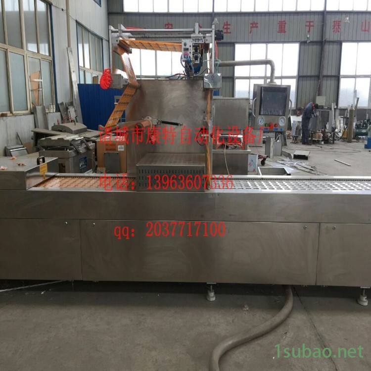 连续拉伸真空包装机须使用成形模具,先把薄膜加热,而后再用成形模具冲成容器的形状,然后将包装物装入成型了的下膜腔中,再进行真空包装。