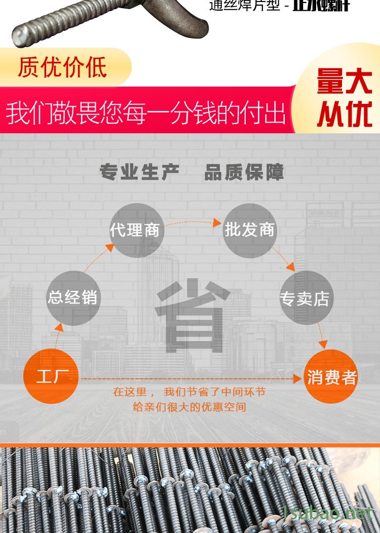 我们可以从止水螺杆的直径,就是它的粗度,也是非常重要的指标之一,当客户来询问价格或咨询止水螺杆的使用时,我们都会先谈直径,一般情况,止水螺杆从直径来分,工地常用的有三种:12mm,14mm,16mm。关于怎么选择,我们可以根据板墙的高度或者不同的需求来选择不同直径的止水螺杆。