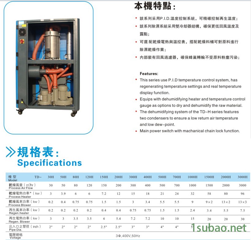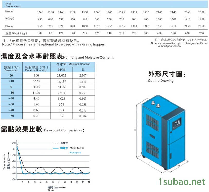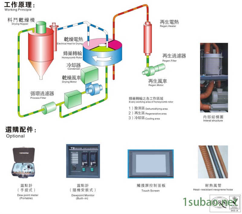 SD-H系列蜂巢转轮除湿机主要是用来对吸湿性较强的工程塑料进行高效率的除湿作业。本公司所采用的蜂巢转轮在理想状态下露点可达到-40℃;全系列采用P.I.D.温控系统为标准装备,另提供PLC控制搭配LCD控制触控式人机界面供选购,提供可实时监控机器除湿效果的露点计供选配,该系列产品共有14种机型,最大干燥风量可达4000m3/hr。