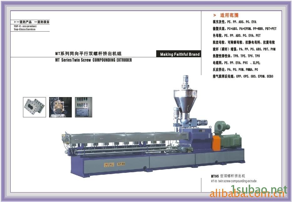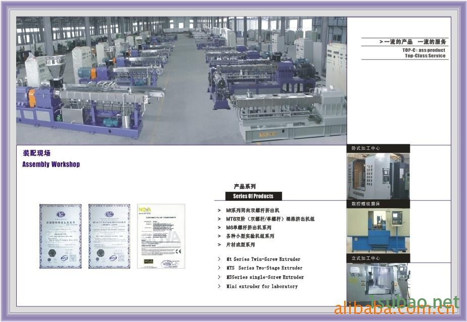 本公司开发研制出新型的高扭矩、高转速、高产量MM系列同向平行双螺杆挤出机、ME系列双阶挤出机和MD系列单螺杆挤出机对各类塑料及橡胶等高分子材料的均质、塑化、着色、共混、填充、增强及回收等作业具有更加广泛的应用。