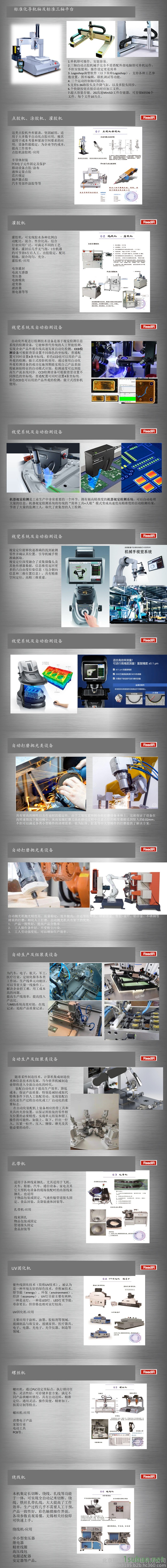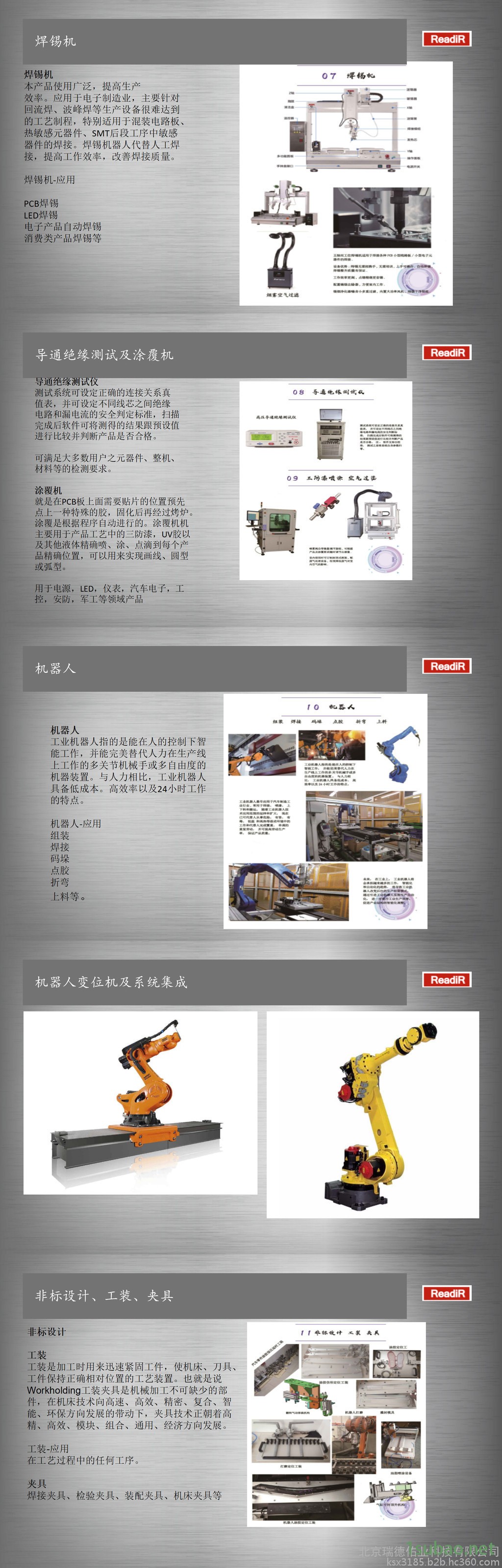 公司可根据您的具体需求提供工装夹具、全自动点胶机、螺丝机,双组份自动灌胶机、在线式高速喷射点胶机、全自动涂覆机、全自动打磨机器人、全自动焊接机器人、全自动非标自动化生产线及设计机器人装配搬运生产线等。 从系统设计、安装、调试及售后各个环节为您提供技术支持及服务。
