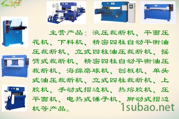 主营产品:15-30吨摇臂式裁断机,25-30吨液压平面式裁断机,35-200吨精密四柱裁断机,包括双边全自动送料裁断机、平面冲床、平面压花机、立式四柱裁断机、油压裁断机、珍珠棉裁断机、砂纸机、下料机、鞋机、啤机、裁床,全自动切捆条机,注塑机等,并提供辅助设备及裁断机维修服务。