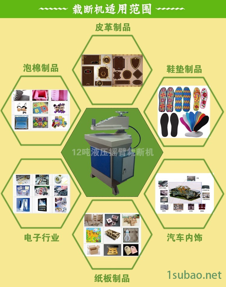 十字绣鞋垫制品专用的12吨液压摇臂裁断机能冲裁28cm以内的冲刀(刀模)。无论原材料是多厚,无论您想冲裁多少层,而咱们设备只能冲裁3.5~4cm之内的原材料。注:8吨液压摆臂式裁断机在液压式裁断机里是**小吨位,很多客户因为这台小型裁断机价格便宜,而并非根据自身刀模(冲刀)大小而选购的裁断机请勿拍购,谢谢!