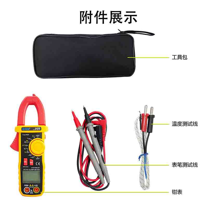 随机附件 | 钳表:1件;表笔:1套;温度传感器:1件;LR03电池:2节;工具包:1件 | |