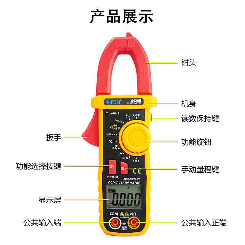 2. 电流量程:AC 600A,钳口尺寸:27mm。电容测量量程扩大到10mF且测量大电容速度快。