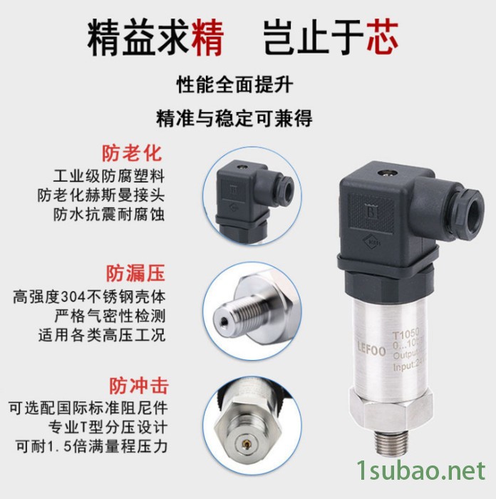 广泛应用于消防、水处理、供水系统、空气压缩机、气动装置、工厂自动化等测试系统中流体介质压力的测量。采用高过载能力的陶瓷敏感膜片或者不锈钢膜片,拥有很好的抗腐蚀、抗磨损性能,采用ASIC技术,MEMS技术,数字补偿,体积小,价格低,可应用于各种复杂环境。内部压力芯体和芯片均从德国进口,采用军 工技术和工艺进行大规模生产,设计先进,工艺完善,设备精良,质量保证体系健 全,行销全球40多个地方。 产品特点 ■ 采用高过载能力的陶瓷敏感膜片或者不锈钢膜片 ■ 很好的抗腐蚀、抗磨损性能 ■ 采用ASIC技术,数字补偿■ 体积小,可应用于各种复杂环境
